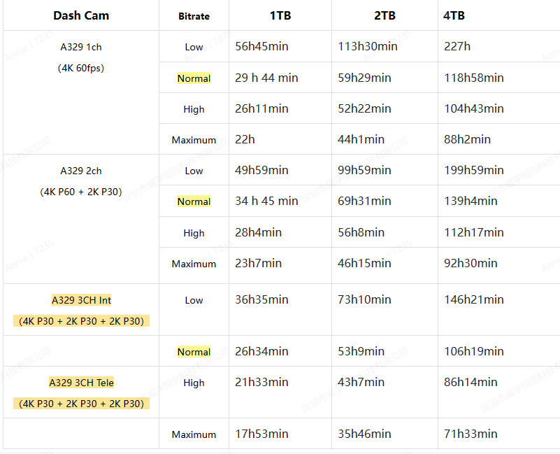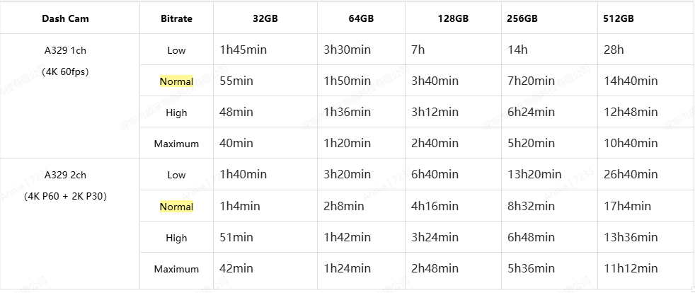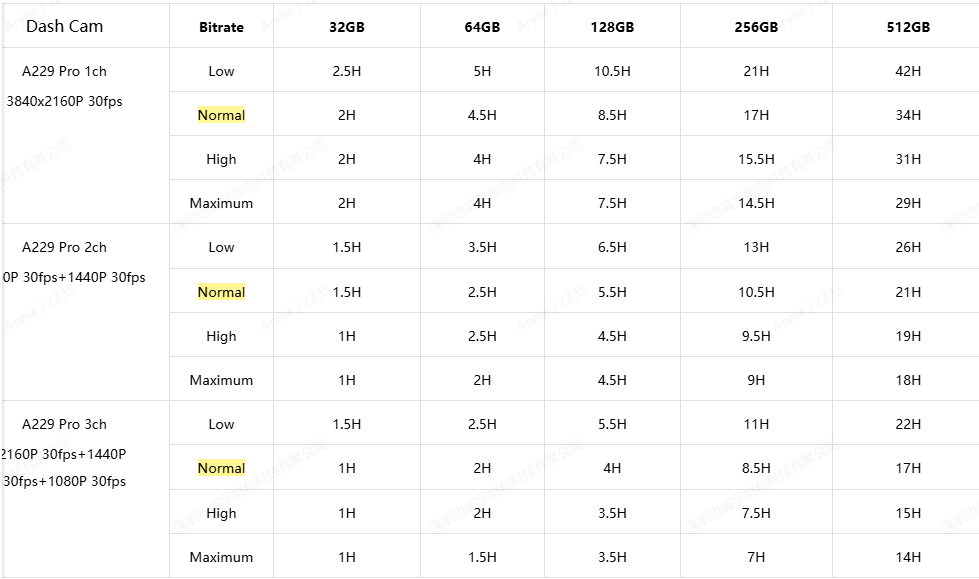 Below is the estimated time a card can record with different bitrates for normal recording.